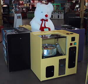 Four Low Profile Crane-Vac Games in a Square with Stuffed White Bear.