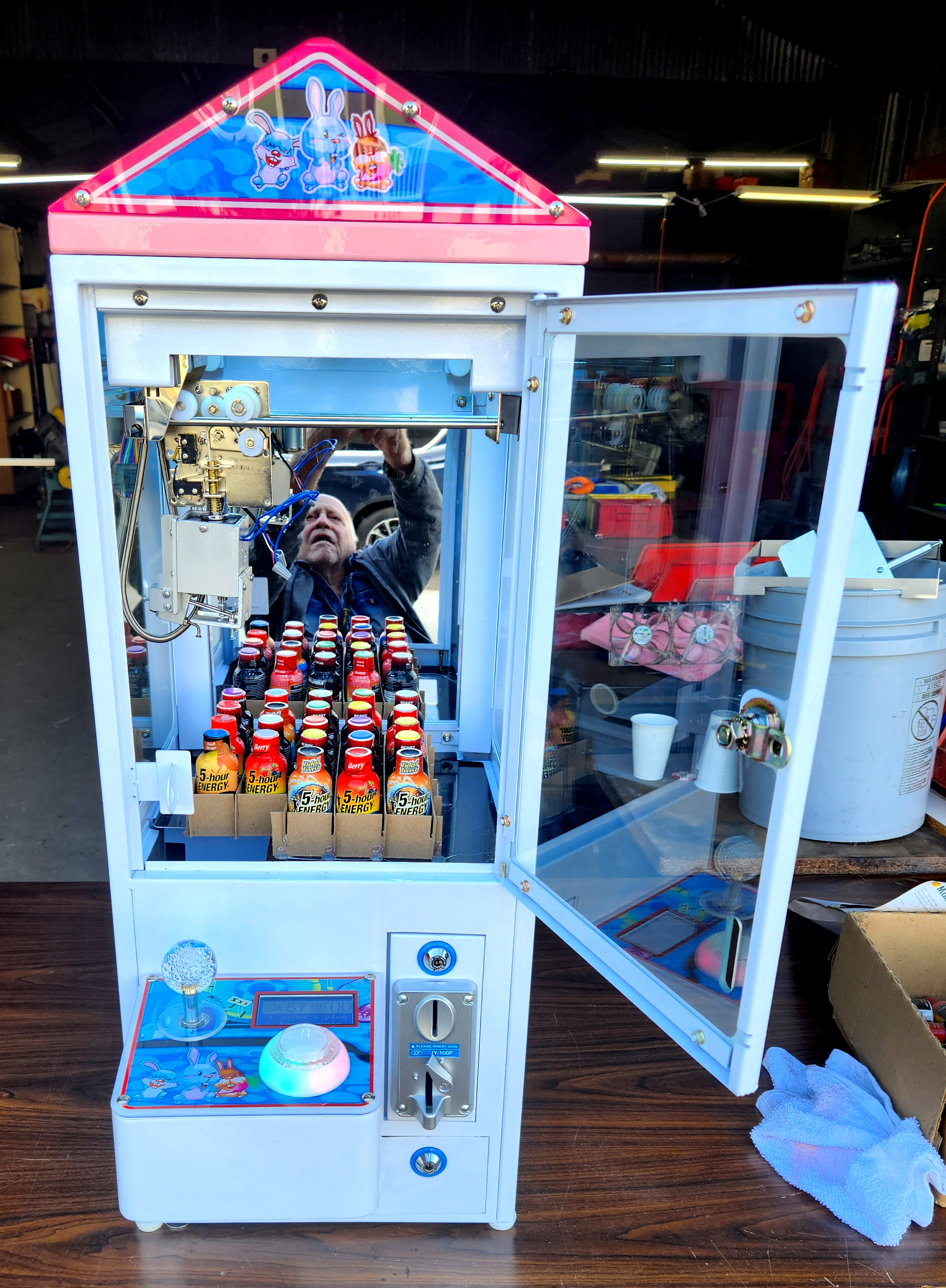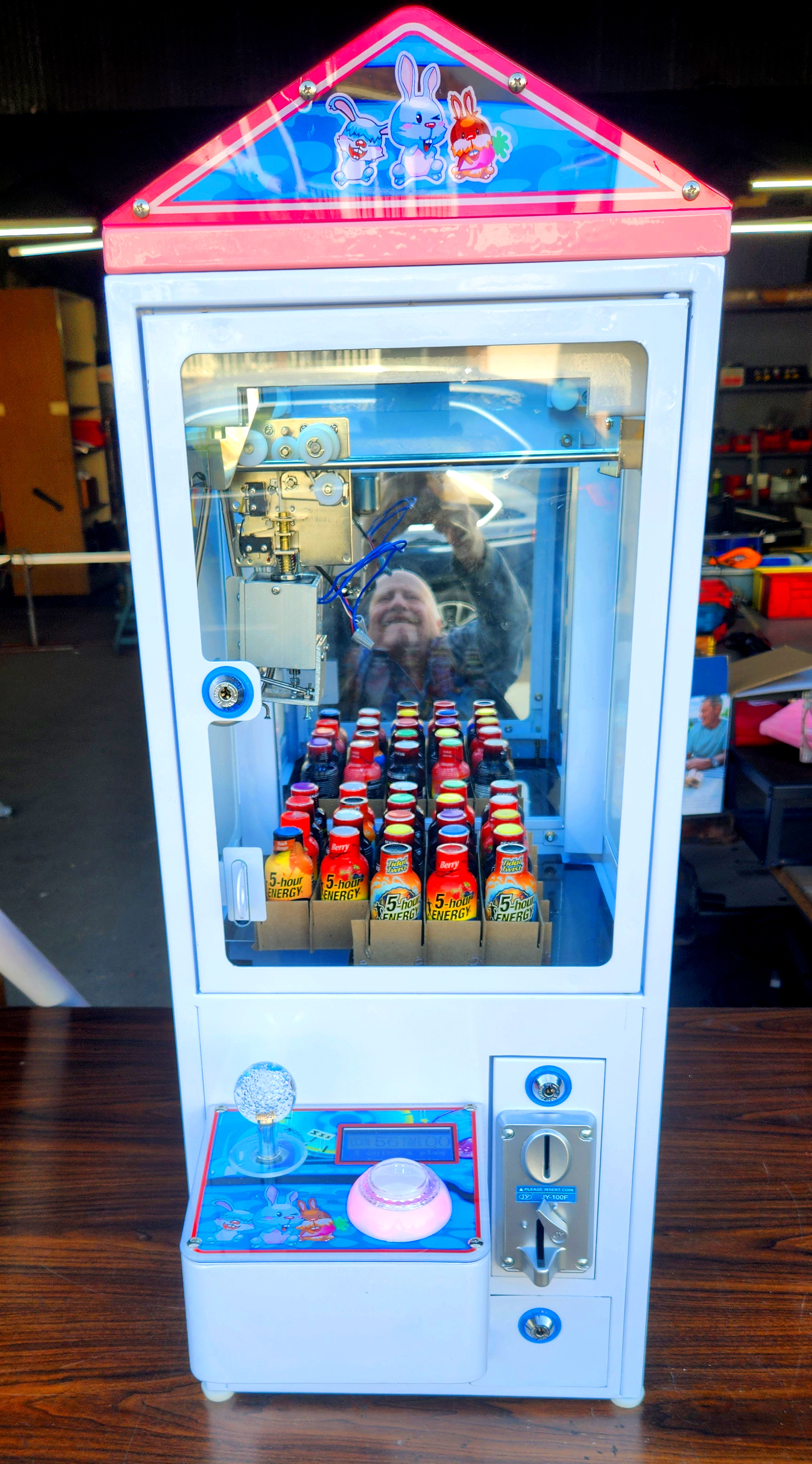 This new claw crane is designed for aluminum cans, soft plastic items, tubes. Game is 12 X 12 X 30 inches